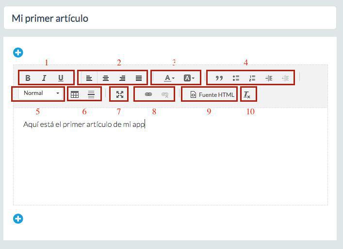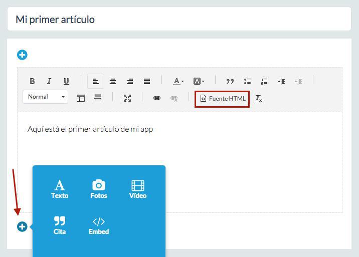 9. La Fuente HTML, en la barra de herramientas, te permitirá insertar el código HTML que leerá tu app. Todo el párrafo aparecerá en formato HTML.