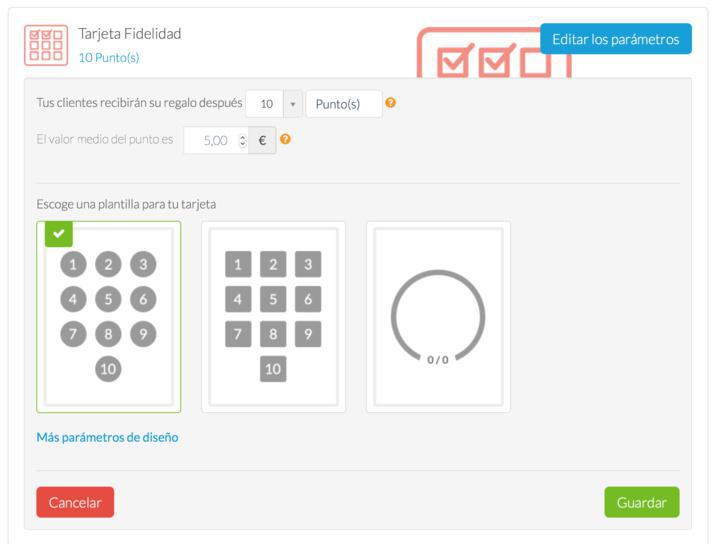 La primera pestaña Carta de Fidelidad muestra las opciones relativas al funcionamiento de la tarjeta. Podrás escoger el número de puntos que la componen, el valor de cada punto (te permitirá calcular el retorno de la inversión), también, podrás escoger el formato de la tarjeta con los 3 modelos proporcionados.
