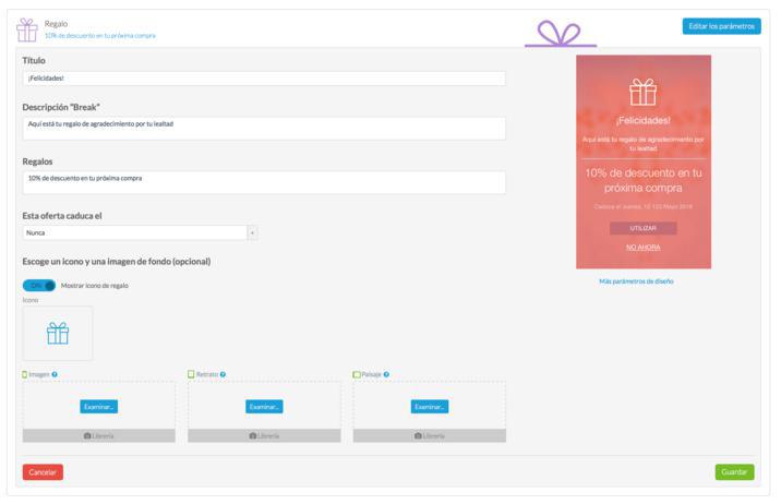 Puedes escoger el título, la descripción, el contenido del regalo y la fecha de caducidad. A la derecha de la pantalla puedes ver los cambios de las modificaciones que estés realizando en el aspecto visual de tu regalo. Haciendo clic en la pestaña "Más parámetros de diseño" se te enviará al menú App donde podrás acceder a todas las opciones de personalización.