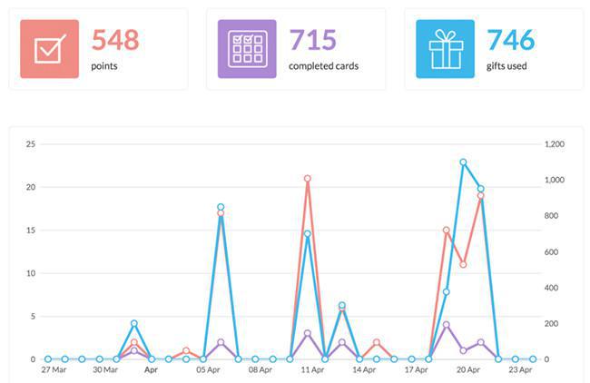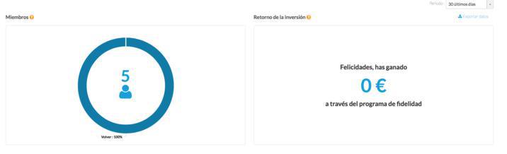Dentro de la parte dedicada a la tarjeta de fidelidad, puedes encontrar la información relativa al número de puntos calidades, el número de tarjetas completadas, el número de regalos utilizados por tus clientes, y una gráfica que os indicará la evolución de las cifras en función del período.