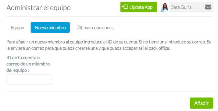 Invitar a una persona a unirse a tu equipo introduciendo el ID de tu cuenta. Si esta persona no tiene su ID simplemente debes introducir su dirección de correo electrónico. Acto seguido,  una invitación se le envía al correo introducido, con el cual se puede conectar al back office y elegir una contraseña. A continuación, se añade a tu equipo directamente.