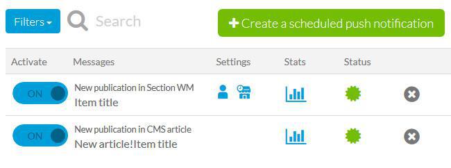 Puedes desactivar una o varias reglas con el botón ON / OFF , ver el contenido del mensaje, la configuración de orientación que se utiliza, estadísticas , así como el estado de la notificación (verde : push automático activo; negro : push automático desactivado ; reloj : notificación programada a una hora para el futuro).