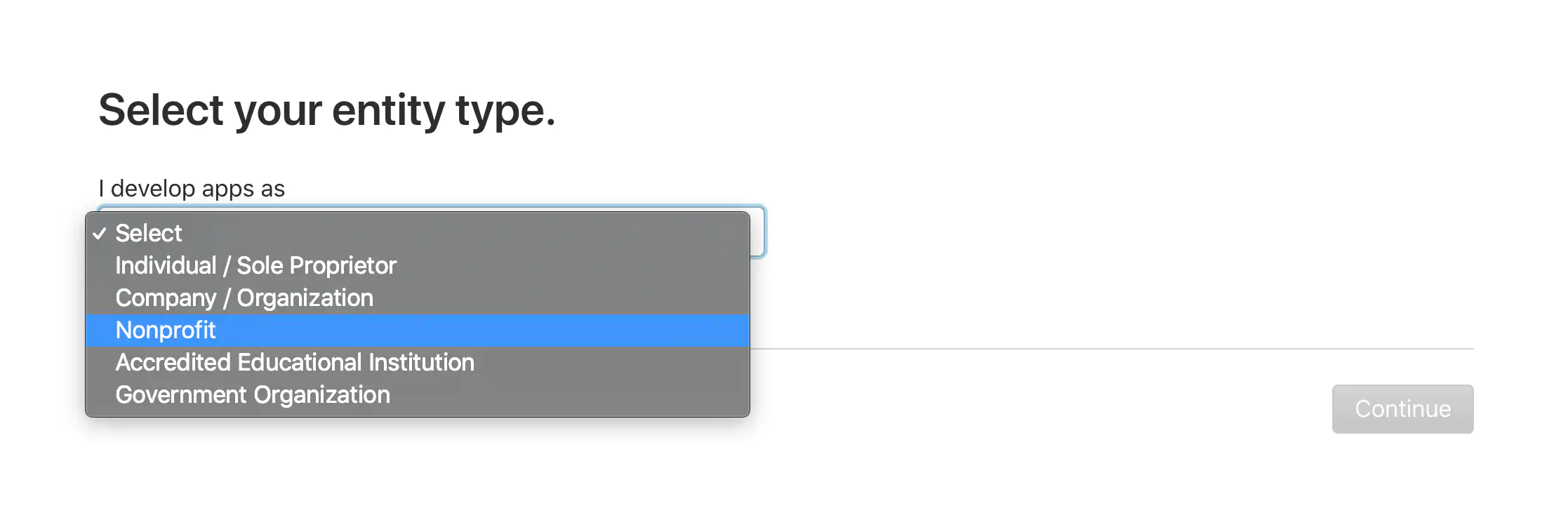 • En la página siguiente, cuando se le pregunte por el tipo de entidad de su organización, deberá inscribirse como organización seleccionando Organización sin ánimo de lucro o simplemente un tipo de entidad de organización normal si no es una organización sin ánimo de lucro. Es crucial que seleccione esto y NO seleccione Individual como tipo de entidad, ya que Thesi no podrá gestionar su aplicación.