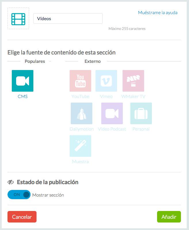 También podrás escoger en qué sección o secciones se mostrará el vídeo (las secciones se pueden configurar a través de Configuración de la sección).